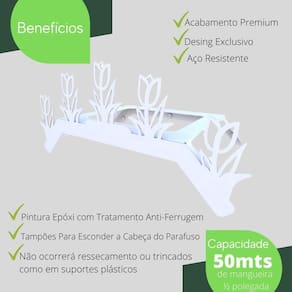 Suporte Enrolador De Mangueira De Jardim Tulipa Branco Mangueira de Jardim é um item que não pode faltar em nossa casa, porém, se você não armazenar de forma adequada, surgem alguns problemas como ficar torcida, dificuldades para desenrolar ou ocupar grande espaço de forma desordenada.
