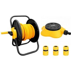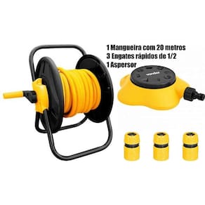 Kit composto de 1 enrolador de mangueira sem rodas Vonder + 20 m Mangueira para jardim, superflexível, 1/2" + 3 Engates rápido 1/2¨ passagem livre Vonder + 1 Irrigador plástico múltiplo IM 601 VONDER