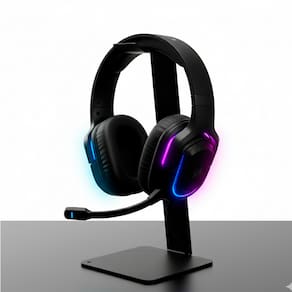Suporte para headset em aço carbono com pintura epóxi, acabamento preto fosco. Design robusto para organização e proteção de fones de ouvido em setups gamers e home office.Vendido por Inovar Metais e entregue por Casas Bahia