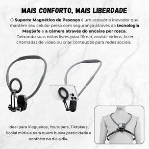 Suporte magnético alça de pescoço para celular smartphone Cor: preto O suporte magnético de pescoço magsafe é o acessório inovador que todo criador de conteúdo precisa. Produzido em pc/abs, liga de zinco e silicone macio, o suporte é leve, resistente e ergonômico, projetado para longas horas de uso sem machucar o pescoço. Sua tecnologia magnética magsafe mantém o smartphone firme e seguro, e a base com rosca universal 1/4 permite conectar câmeras compactas ou acessórios. Especificações: Dimensões do suporte: 30 22 4,2 cm Peso: 386 g Material: pc/abs + liga de zinco + silicone Compatibilidade: com magsafe, celulares com anel magnético incluso, câmeras/acessórios com rosca 1/4 Conteúdo 1x suporte magnético de pescoço 1x corda anti-perda 1x parafuso 1x suporte magnético 1x folha magnético 1x anel magnético 1x alça fixa de tecido adesivo ponta dupla 1x manual de instruções Anúncio referente a suporte magnético de pescoço Acessórios que ambientam as fotos não inclusos. Marca: Não Informado Ean: 7793596667605