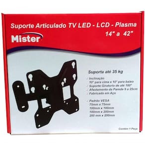 Suporte Metálico Articulado Tv Mister Suporte Tv Lcd/Led/Plasma Articulado 14 a 42 polegadas Vesa 75x75, 100x100, 100x200, 200x200 - Suporta até 35kg. Inclinação 5 para cima e 10 para baixo. Afastamento da Parede 9 a 25cm. Fabricado em Aço. Ean: 7899583307810