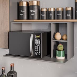 Com um nicho para micro-ondas ou forno elétrico, você poderá instalar esse armário aéreo próximo à pia ou fogão, facilitando a dinâmica na hora do preparo de alimentos. Além disso, por ser suspenso, a segurança está garantida, principalmente se você tem crianças em casa, pois não terão acesso por estar no alto. Já os dois nichos menores na lateral são perfeitos para dispor objetos decorativos ou até mesmo potes de tempero e , assim, deixar o espaço com aquele toque especial.