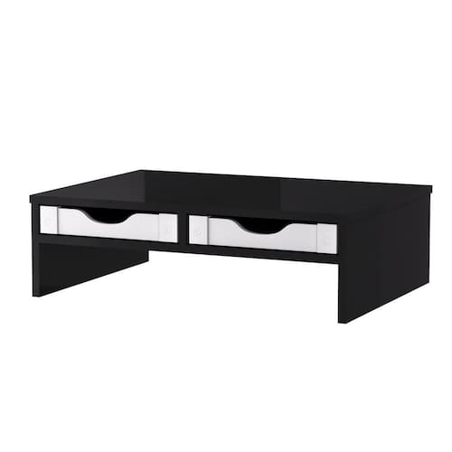 Este é um suporte de monitor elegante e funcional, projetado para elevar seu monitor a uma altura mais ergonômica, ajudando a reduzir a tensão no pescoço e nos olhos. Ele apresenta um design minimalista com uma superfície branca lisa e duas gavetas de armazenamento em madeira com puxadores circulares metálicos, perfeitas para guardar pequenos itens de escritório, como canetas, blocos de notas ou cabos. É uma solução prática para otimizar o espaço da sua mesa, mantendo-a organizada e adicionando um toque de estilo moderno ao seu ambiente de trabalho ou estudo.