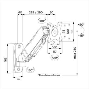 Suporte monitor / tv 17 a 34 pistão a gás f420 central suportes - modelo: f420 Suporte articulado para monitor / tv de 17 a 34 polegadas com pistão a gás e ajuste de altura f420 central suportes O modelo f420, possui sistema de braço articulado com pistão a gás, que possibilita ajuste de altura e diversos movimentos de forma leve e prática. Indicado para monitores lcd / led de 17 a 34, com peso de 2 até 9kg e que possuam padrão vesa de fixação de 75x75, 100x100mm hxv . É possível utilizar um jogo de extensores vesa modelo ext400 vendido separadamente para atender Aos padrões vesa 200x100 e 200x200mm hxv , tornando o suporte compatível também com tvs de 32 Os itens das fotos ambientadas são apenas ilustrativos e não acompanham o suporte mesa, vasos, monitor, teclado, mouse, cabos... . Atenção - o peso da tv deve estar obrigatoriamente na faixa de 2kg mínimo até 9kg máximo . - tvs com peso inferior a 2kg vão ficar abaixo do peso mínimo e o pistão interno ficará sempre na altura máxima do suporte. - tvs com peso superior a 9kg vão ficar acima do peso máximo e o pistão interno não conseguirá manter a altura desejada. - fabricado em alumínio injetado e aço carbono com pintura epóxi eletrostática de alta resistência. - tratamento anti-corrosão e acabamento de alto padrão. - possui carenagem e alças plásticas para passagem e organização dos cabos. - por ser um suporte full motion, pode cobrir praticamente todos os pontos de visualização do ambiente para entretenimento, videoconferência ou jogos. Ajuste de altura Variação de 25cm do ponto mais baixo ao ponto mais alto com pistão a gás. Distância da parede - mínima: 7cm braços recolhidos - máxima: 38cm braços esticados Dimensões da base de parede - altura da base: 16,5cm - largura da base: 6,5cm Giro horizontal da tela: 180 esquerda / direita - limitado ao tamanho da tela da tv Rotação da tela: 360 retrato / paisagem Ajuste de inclinação: +45 para baixo / -90 para cima para baixo ou para cima Ajuste de inclinação lateral para manter a tela sempre nivelada Extras - total flexibilidade para movimentos, sem esforço e sem a utilização de ferramentas. - pistão a gás e juntas desenvolvidas para fornecer movimentos suaves e estáveis. - desenvolvido para melhorar sua experiência de visualização. - design compacto e retrátil que economiza espaço. Local de instalação - alvenaria parede de tijolo ou bloco . - painel de madeira / mdf. Importante Pode ser instalado em alvenaria ou painel, lembrando que a superfície de instalação precisa ser forte para resistir ao peso combinado da tv mais suporte. Para instalar na madeira normalmente é necessário usar parafusos adequados à espessura da chapa. Características gerais do produto: Padrão vesa mm : 75x75; 100x100 Com pistão a gás: sim Tamanho da tela: de 17 a 34 Modo de fixação: parafusado Peso suportado: de 2,2 à 9kg Local de instalação: parede / painel Cor do suporte: preto Acompanha o produto: Suporte f420 Acessórios para instalação do suporte na parede e fixação do monitor / tv Chaves para ajuste do suporte e regulagem do pistão Manual de instruções : 1 ano junto ao fabricante