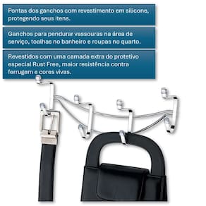 Para fixação em parede ou em portas, o Suporte Multiuso tem ganchos para pendurar vassouras na área de serviço, toalhas no banheiro e roupas no quarto.
