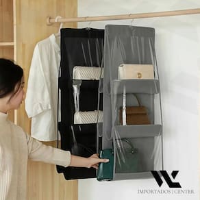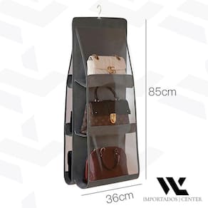 Suporte Organizador De Bolsas Para Cabide Armário Guarda Roupa Preto 8327 Economiza espaço com o design que você procura. Projetado de forma que sirva para os mais diversos tipos de bolsas São 6 colmeias, 3 de cada lado. O cabide e nem as bolsas acompanham o produto e tem que ter aproximadamente de 33 a 36cm de largura para se adaptar bem ao produto, pois o organizador não é vazado em cima, nas laterais, como pode ser visualizado na foto