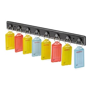 - Contém 1 suporte com 8 chaveiros - Medidas: 37,0x11,0x1,0cm - Composição: plástico e ferro - Referência: 10180001