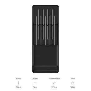 Suporte Organizador Gaveta Porta Facas Cozinha Divisória Ou Cor: Branco Porta facas de gaveta organizador Clear Ou despachamos em até 24h após o pedido qualidade altíssima A Linha Clear é a união entre transparência e organização que independente do ambiente, promove um design perfeito para organizar e aumentar o espaço das suas gavetas. O organizador de facas foi pensado para permitir diversas composições e proporcionar máximo aproveitamento de espaço nas gavetas, por isso, comporta 9 facas sendo 5 facas grandes e 4 facas pequenas, além de divisórias que preservam o fio das facas. Combine, encaixe e enxergue facilmente o conteúdo, mantendo tudo em ordem. Produzido em material resistente que proporciona alta transparência, fácil higienização e praticidade na hora de organizar. A linha clear é indispensável para auxiliar você na organização da sua casa. - Ficha técnica: Marca: Ou Linha: Clear Medidas: 5,6 x 15 x 37,5cm A x L x P Peso: 384g Material: plástico - Cuidados com o produto: Não utilizar materiais abrasivos, lavar com detergente neutro Imagens ilustrativas