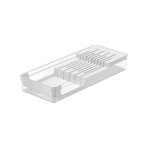 O organizador de facas foi pensado para permitir diversas composições e proporcionar máximo aproveitamento de espaço nas gavetas, por isso, comporta 9 facas sendo 5 facas grandes e 4 facas pequenas, além de divisórias que preservam o fio das facas. Combine, encaixe e enxergue facilmente o conteúdo, mantendo tudo em ordem.