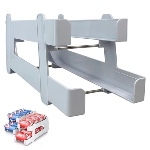 O organizador comporta até 8 latas padrao (350ml), proporcionando um armazenamento adequado para quem quer reduzir a desordem na geladeira. Conforme você retira as latas do andar inferior, as que estão no andar superior rolam para baixo.