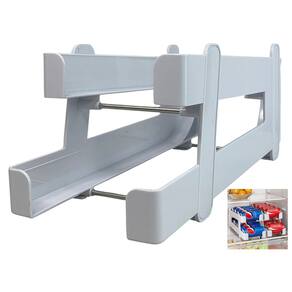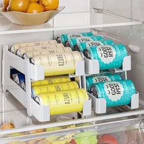 O organizador comporta até 8 latas padrao (350ml), proporcionando um armazenamento adequado para quem quer reduzir a desordem na geladeira. Conforme você retira as latas do andar inferior, as que estão no andar superior rolam para baixo.