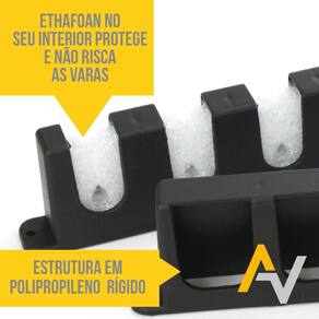 Produzido em polipropileno rígido em sua estrutura e espuma ethafoan no seu interior, possibilita o condicionamento de até 6 varas, independentemente do seu tamanho ou espessura. Suporte prático e inteligente: Sua fixação é simples, feita através de parafusos. Não ocupa espaço, podendo, assim, ser instalado em pequenas áreas na parede ou mesmo atrás de portas. É o suporte inteligente para manter organizada e segura sua tralha de pesca. O Stick Rack é útil também para quem deseja expor estes materiais, no caso de lojistas e colecionadores. Produtos Cardume. ============================================= ESPECIFICAÇÕES Tamanho: aprox. : 34cm X 6cm Suporte para 6 varas. Material da estrutura: polipropileno rígido em sua estrutura e Material do interior: espuma ethafoan Marca: Não Informado