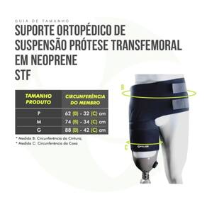 Descrição Comercial: Suspensão ortopédica transfemoral de tecido com revestimento interno em neoprene. Ajuda a manter a prótese bem fixada ao coto.