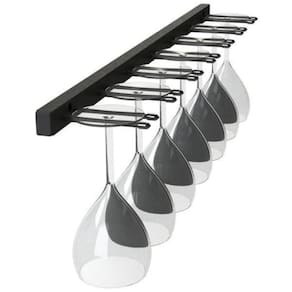 nosso porta taças permite a armazenagem de taças com bojo de até 12cm de diâmetro. São fabricados em aço e possuem acabamento com pintura eletrostática na cor preta. Ponteiras em vinil e materiais de engenharia. O charme que faltava para a sua adega. Parafusos e buchas para fixação acompanham o produto.