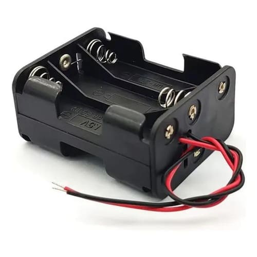 Suporte para 6 pilhas aa 1,5v com conexão em série, totalizando 9v. Ideal para projetos eletrônicos, robótica, prototipagem e aplicações diy. Fabricado em plástico resistente com molas metálicas e fios para soldagem ou conexão direta.