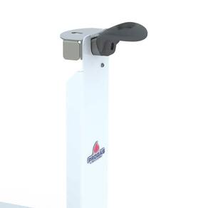 O suporte possui base e coluna em aço com pintura epóxi, acoplamentos em aço inox, alças em baquelite e pés antiderrapantes, garantindo durabilidade e estabilidade.