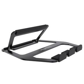 Amazon Basics Suporte dobrável portátil de alumínio para laptops de até 13 polegadas, preto - Suporte dobrável para laptops de até 13 polegadas com inclinação de 18 graus e elevação de 7,5 cm - Feito de alumínio leve e durável com almofadas de superfície de borracha antiderrapante para manter o laptop no lugar - Mecanismo dobrável que dobra o suporte embaixo para armazenamento ou transporte plano - Permite circulação de ar extra para ajudar a ventilar e resfriar os componentes eletrônicos do seu laptop - Use em casa, no escritório, na cafeteria ou onde quer que o trabalho leve você - Base de borracha para evitar escorregões e arranhões em mesas ou mesas