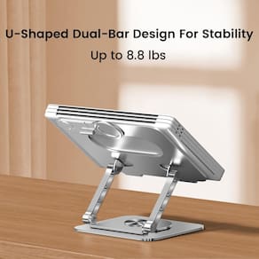 Eleve seu espaço de trabalho digital com este suporte de laptop de alumínio premium, projetado para ergonomia ideal e conforto de visualização. As configurações ajustáveis de altura e ângulo permitem que você posicione seu dispositivo no nível perfeito, reduzindo a tensão no pescoço durante longas sessões de trabalho. Este suporte resistente possui um acabamento prateado elegante, pés de borracha antiderrapantes para estabilidade e um design cuidadoso que promove melhor fluxo de ar ao redor do seu dispositivo. O mecanismo dobrável facilita a embalagem e o transporte, enquanto a estrutura de metal durável garante um desempenho duradouro. Compatível com laptops e tablets que variam de 25 a 16 polegadas, este suporte versátil é um acessório essencial para configurações de home office e estações de trabalho móveis. A base rotativa adiciona flexibilidade às suas opções de visualização, tornando-a perfeita para apresentações ou trabalho colaborativo.