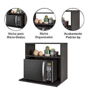 Produzido em mdp de qualidade, o suporte garante resistência, estabilidade e durabilidade. Sua estrutura firme proporciona apoio seguro para o micro-ondas, enquanto os nichos ampliam as possibilidades de uso sem ocupar espaço extra.