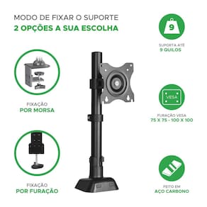 Organize seu espaço de trabalho com o suporte para monitor PX-DME32S1 da PIX. Com ajuste de inclinação, articulação e rotação de 360, você encontra a posição ideal para maior conforto e produtividade. Suporta até 9kg e é compatível com a maioria dos monitores de 10 a 32 com padrão VESA 75 x 75 até 100 x 100. Especificações Técnicas: - Modelo: PX-DME32S1 - Suporte: Ajustável - Capacidade: até 9Kg - Para monitores LED/ LCD de 10 a 32 - Rotação: 360 graus - Inclinação: 75 graus - Articulação: 180 graus - Compatível padrão VESA: 75 x 75 até 100 x 100 - Fixação: Morsa ou por furação - Kit completo: acompanha parafusos e chave allen para instalação - Fácil instalação - 5 Anos de Marca: Não Informado