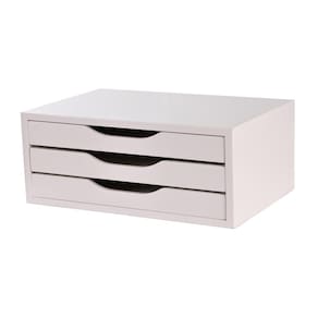 Características e especificações Sku: 1002552 Fabricante: Souza Código Fabricante: 3343 Material: MDF Cor: Branco Quantidade de gavetas: 03 Altura das gavetas: 04cm Dimensões do suporte: Largura: 38cm Altura: 15,5cm Profundidade: 25,5cn Com cantoneiras Cantos arredondados