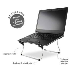 - regulagem de inclinação; - permite múltiplas opções de inclinação para o notebook, através de diferentes regulagens das hastes de apoio; - elevação frontal; - suporte apresenta elevação frontal regulável em até 11cm de altura; - pronto para usar – basta montar e pronto sem necessidade de qualquer ferramenta;