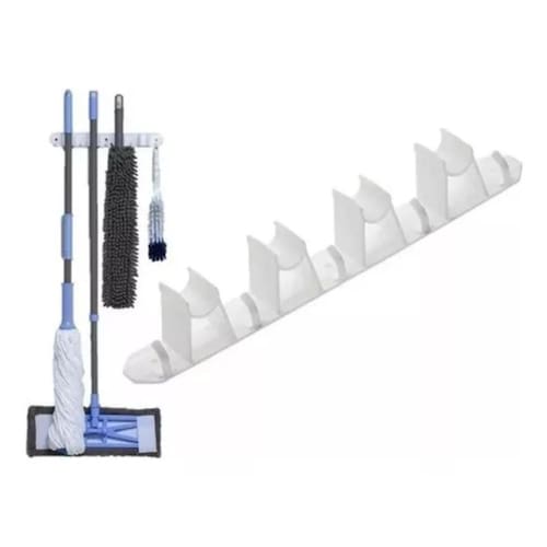 Suporte para rodo e vassoura com capacidade para 4 vassouras, feito de polipropileno resistente na cor branca.