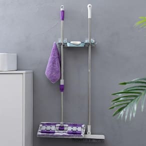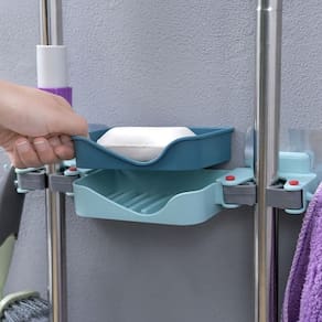 O Suporte Para Sabonete, Vassoura e Rodo é uma ótima maneira de deixar seu banheiro, ou Lavanderia mais limpa e organizada. Ele possui dois apoios Emborrachados para rodos e vassouras, uma saboneteira com Revestimento removível, e ganchos nas laterais para apoiar outros Objetos do seu dia a dia. Sua fixação por suporte adesivo não vai Danificar a parede em que for colocada. É recomendado esperar 24 Horas após a instalação do suporte para utilizar.