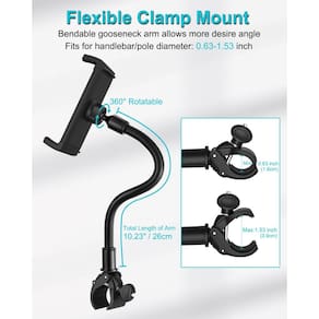 Braço flexível, rotação 360°, fácil instalação em bicicletas e esteiras.Uso