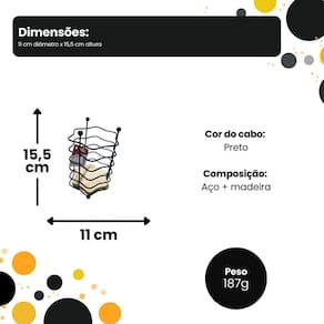 Especificações: Dimensões: 11 cm diâmetro x 15,5 cm altura Composição: Aço + madeira Cor: Preta com base em madeira natural Peso: 187 g