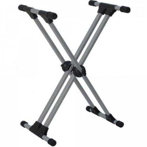 Suporte Metálico em "X", para Teclado, modêlo profissional, com altura regulável de 74 a 100 cm. Sustentação dupla.Aplicação:Para Teclado Dimensões:Altura máxima: 1000 mm Altura Mínima: 660 mm Largura Máxima: 410 mm Largura Mínima: 870 mm Comprimento: 405 mm Cor:Metálico