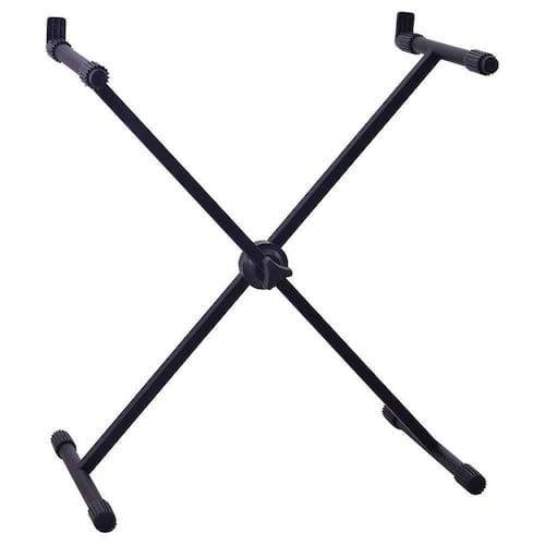 Suporte para teclado x10 preto O suporte para teclados x10 possui estrutura em “x” com regulagem de altura, base e apoios em ferro e pintura eletrostática Menor que o x30, geralmente é usado na posição sentado, leve e pratico Capacidade 15 kg Peso 2,6 kg Dimensões comp. 43; alt. 92; larg. 12 cm