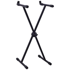 Suporte para teclado x10 preto O suporte para teclados x10 possui estrutura em "x" com regulagem de altura, base e apoios em ferro e pintura eletrostática Menor que o x30, geralmente é usado na posição sentado, leve e pratico Capacidade 15 kg Peso 2,6 kg Dimensões comp. 43; alt. 92; larg. 12 cm