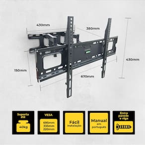 Características Técnicas: • Compatível com TVs de 37? a 86?; • Suporta até 40 kg; • Padrão VESA Compliance: 695mm/335mm/220mm; • Distância da parede: 110 mm a 450 mm; • Rotação: +80° a -80°; • Inclinação: 0° a -15°; • Ideal para salas, quartos, escritórios e espaços comerciais.