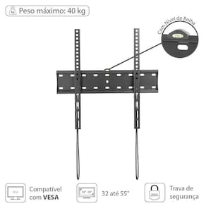 Material: Aço Cor: Preto Tamanho suportado: com televisores e monitores 32''-55 Padrão de Fixação: VESA 200x200,300x300,400x200,400x400mm comprimento / altura - 434x25mm Distância minima x máxima da parede - 25mm Peso Máximo suportado: 40kg Nível de bolha e trava de segurança inclusos Parafusos e manual incluídos;