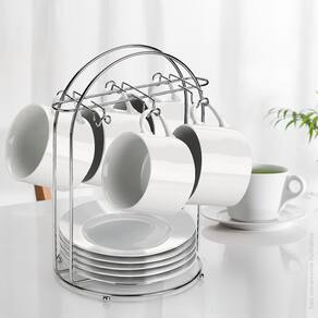 Suporte para Xícaras de Chá ART COOK Arthi Cromado - Organização Vertical O Suporte para Xícaras de Chá ART COOK da Arthi é o acessório ideal para armazenar e expor conjuntos de xícaras de chá de forma elegante e organizada. Seu design vertical otimiza o espaço da bancada ou do armário, mantendo as xícaras acessíveis e seguras. Características Físicas e Funcionais: Organização Vertical: Projetado com altura maior (26,5 cm) e estrutura para acomodar xícaras de chá (tamanho maior que as de café), liberando espaço horizontal. Design de Mesa/Bancada: Estrutura estável, perfeita para ser utilizada na copa, área de café ou cozinha. Proteção: Mantém as xícaras suspensas, protegendo-as de arranhões e facilitando a secagem. Material Premium: Fabricado em Aço Cromado, conferindo resistência, durabilidade e um acabamento brilhante e moderno. Marca: Arthi (Ref. 1617). Especificações Técnicas: Dimensões: Comprimento 18,7 X Largura 16 X Altura 26,5 cm Material: Aço Cromado
