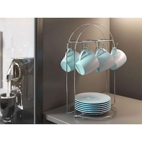 Suporte Para Xícaras E Pires De Café Cromado Suporte Para Xícaras e Pires de Café Cromado - Suporte Para Xícaras e Pires de Café Cromado Suporte para Xícaras e Pires de Café. Todo mundo tem aquele lugar da casa que é seu xodó, e para muitos, esse lugar é o cantinho do café. Um ambiente aconchegante, com aperitivos e todos os utensílios necessários para fazer um bom café e relaxar. Além de também liberar mais espaço na sua bancada na hora de servir o café, devido ao seu design compacto.