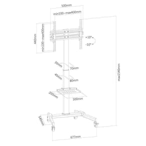 Características Gerais do Produto: - Altura Máxima: 1320mm - Padrão VESA (mm): 100x100; 200x100; 200x200; 200x300; 300x200; 300x300; 400x200; 400x300; 400x400 - Tamanho da Tela: De 37 a 70 - Peso Suportado: Máximo 40kg - Local de Instalação: Chão - Passagem da Fiação: Interna - Inclinação da Tela: Sim - Bandeja: Inferior