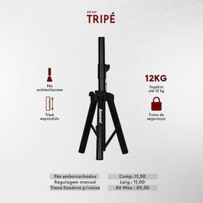 - Qual a capacidade de peso que o tripé suporta? O Tripé ATP 001 suporta até 12kg, garantindo que você possa usar com caixas de som maiores, sem se preocupar com sua segurança ou resistência. Ean: 7898649370805