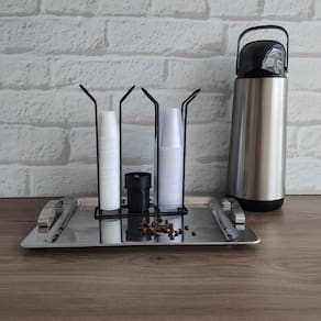 Suporte Porta Copo Descartável 50 80ml e 180 200ml Organizador de Copos e Colheres Café Preto Fosco Stolf #Organização na hora do café #Otimizando o espaço #Linha Black Garantia: 90 dias / Peso: 388g / Cor: Preto Fosco / Ref: 1459BLPSTD Dimensões: 25cm (C) x 7cm (L) x 28cm (A). Tamanho pote redondo: 6cm (D) x 7,5cm (A). Espessura do aço: 5mm. Abertura para copo 50 80ml: 4cm Abertura para copo 180 200ml: 5cm Cuidados: Não lavar com materiais abrasivos. Material: - Plástico; - Aço pintado. Esse suporte acomoda tamanhos diferentes de copos descartáveis, ideal para quem possui pouco espaço mas não abre mão do cantinho do café. O organizador de copos conta também com espaço para mexedores e colheres. Sua bancada sempre organizada e linda com o suporte de copo para mesa.