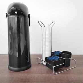Suporte Porta Copos 50ml 80ml Porta Saches Açúcar Colheres Mexedor Organizador #Bancada Organizada #Copos de 50/80ml #Suporte 4 em 1 Garantia: 90 dias / Peso: 380g / Cor: Cromado, Preto ou Branco / Ref: 1457 Dimensões: 17cm (C) x 17cm (L) x 27,5cm (A). Tamanho do pote quadrado: 7cm (C) x 7cm (L) x 5cm (A). Tamanho pote redondo: 6cm (D) x 7,5cm (A). Espessura do aço: 4mm. Cuidados: Não lavar com materiais abrasivos. Material: - Plástico; - Aço carbono cromado: Com uma camada extra de protetivo aplicado sobre a peça que proporciona cinco vezes mais durabilidade e resistência à corrosão. Este lindo suporte é ideal para ambientes corporativos, pois mantém o espaço organizado e decorado. Acomoda em um só suporte colherinhas, copos, sachês de chás e açúcares. Permite à você pegar todo o conjunto de uma só vez, proporcionando rapidez para passar de uma pessoa para a outra e para a limpeza da mesa ou bancada em que estiver.