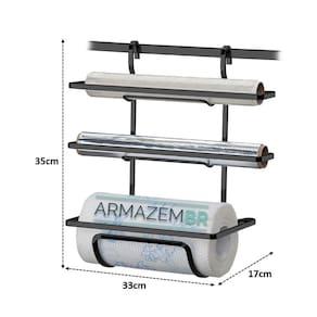 Este suporte acomoda rolos de papel toalha, alumínio e PVC deixando-os sempre à mão na hora de preparar os alimentos. O Suporte também deixa mais espaço livre da bancada pois fica pendurado na barra fixada na parede.