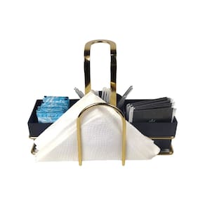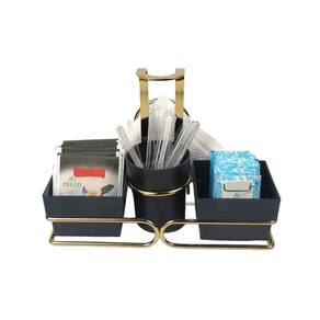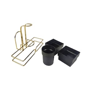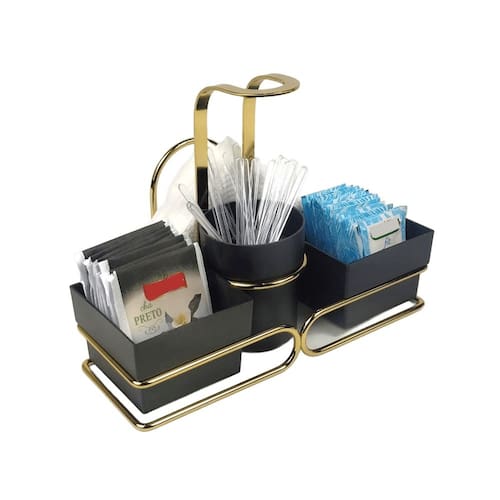 - Acabamento/Cor: Estrutura em dourado brilhoso e potes pretos
