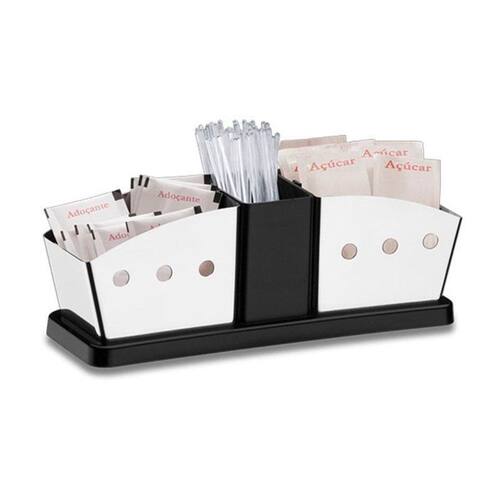 Suporte porta sachês inox café, adoçante e açúcar restaurante ========== sobre o produto ========== Organize seu cantinho do café com muito mais praticidade e sofisticação o suporte porta sachês inox é perfeito para bares, cafeterias, escritórios e uso doméstico. Com divisórias específicas, acomoda sachês de açúcar, adoçante e mexedores de forma elegante e funcional. ========== especificações ========== Material: aço inox e polipropileno Divisórias: 3 compartimentos 2 laterais para sachês e 1 central para palitos/mexedores Comprimento: 19,5cm Largura: 6,5cm Altura: 7cm P: ele enferruja R: não, o aço inox é resistente à corrosão e indicado para uso intenso. P: vai desmontado R: não, já vai montado e pronto para uso. P: cabe sachês grandes R: sim, acomoda sachês padrão de 5g a 7g com folga. P: o produto é novo ou Marca: Não Informado Ean: 7891100011057