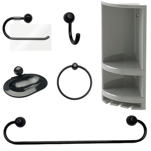 01 suporte de canto para shampoo 01 cabide simples 01 saboneteira 01 papeleira 01 porta toalha argola 01 porta toalha bastão 06 buchas s6 06 parafusos 3 x 37mm