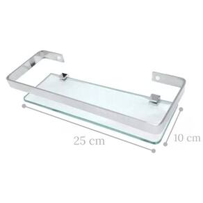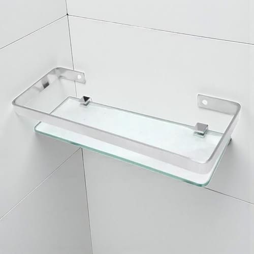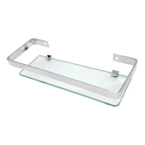strutura em alumínio polido maciço (4 mm de espessura, 16 mm de largura) e base em vidro lapidado de 8 mm, acompanha dois suportes para fixação ideal para manter seus produtos de banho organizados com estilo e resistência.