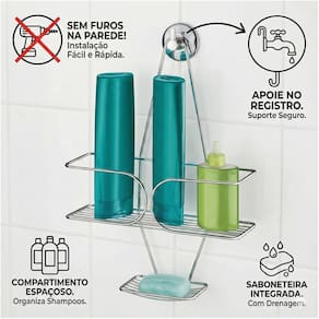 SUPORTE PARA SHAMPOO E SABONETE PARA APOIAR NO REGISTRO Marca: Future Código: 1163 Acabamento/Cor: Cromado #Rust Free #Fácil instalação basta encaixá-lo no registro do chuveiro #Sem furos e sem sujeira #5x Maior Proteção #Porta Shampoo e Sabonete #Maior resistência contra ferrugem #Acabamento brilhoso DESCRIÇÃO: O Suporte para Shampoo é de fácil instalação, basta encaixá-lo no registro do chuveiro e já está pronto para o uso. Sem furos e sem sujeira. Tem espaço específico para o sabonete Acabamento cromado. Uma excelente cobertura protetiva contra corrosão e alta resistência ao impacto. ESPECIFICAÇÕES - Matéria do Suporte: Aço Carbono - Linha: Vantaggio DIMENSÃO E PESO: - Dimensões do produto: 11cm (C) 28,5cm (L) 39cm (A) - Peso do Produto: 0,564Kg