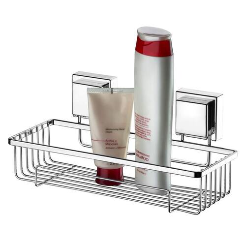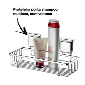 Descrição do produto O suporte de shampoo com fixação por ventosas pode ser utilizado dentro do box com shampoos e condicionadores mas também próximo à pia do banheiro, com seus cremes hidratantes e demais itens de beleza. Acabamento liso e brilhante. A pintura a pó aplicada na peça garante uma excelente cobertura protetiva contra corrosão e alta resistência ao impacto.