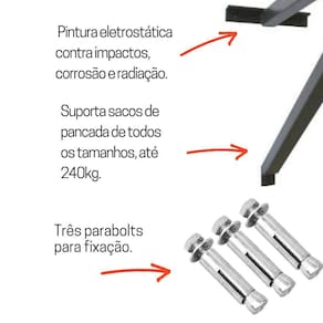 Suporte De Parede Para Saco De Pancada - GORILLASuporta sacos de pancada de todos os tamanhos, até 240kg.Ele acompanha três parabotls. Diferente dos parafusos comuns os parabolts possuem maior fixação pois eles funcionam como chumbadores dando toda segurança que o atleta necessita.Fabricado com aço de alta qualidade o suporte para saco de pancada é zincado não enferruja , sua pintura é feita com a tecnologia eletrostática.Possui 03 pontos de fixação para prender firmemente o suporte ao a parede;Indicações:Para sacos de pancadas até 240 kg;Acompanham o produto:03 Parabolts 09 meses de garantia.Fabricado por Gorilla Indústria e Comércio LTDA. Produto 100% nacional.