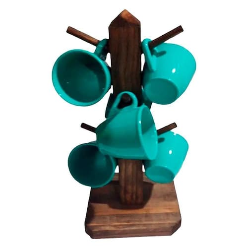 Suporte rústico com 6 xicaras de café acrílico cristal - turquesa Suporte organizador em madeira rústica com 6 xicaras de café / chá em acrílico cristal décor
